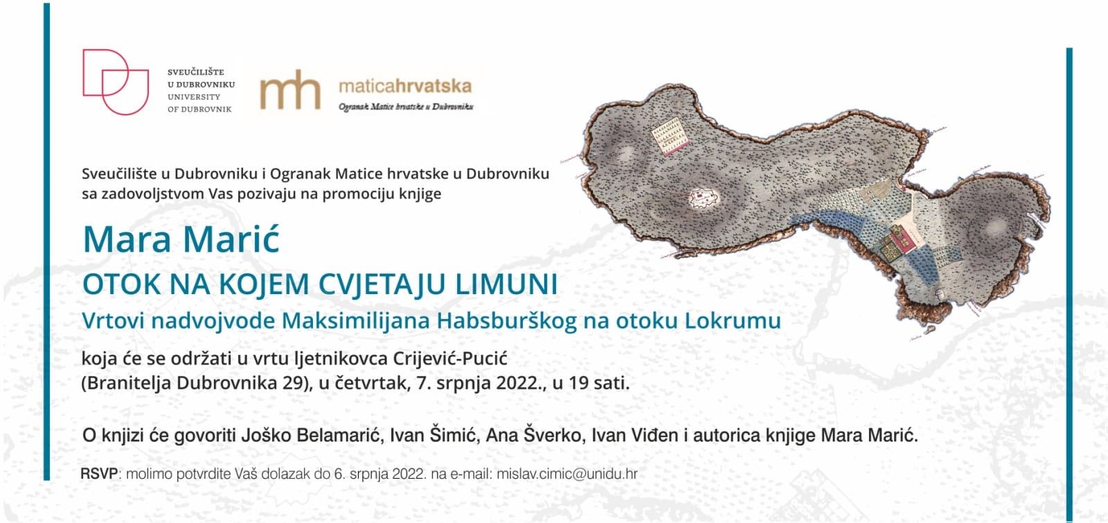 Sveučilište u Dubrovniku i Ogranak Matice hrvatske u Dubrovniku predstavljaju knjigu Mare Marić ”Otok na kojem cvjetaju limuni. Vrtovi nadvojvode Maksimilijana Habsburškog na otoku Lokrumu”. Knjiga donosi do sada nepoznate podatke o životu i djelu austrijskog nadvojvode Maksimilijana I. Habsburškog, kasnije cara Drugog Meksičkog Carstva, ponajprije o njegovoj povezanosti s otokom Lokrumom. Kupnju otoka i...Opširnije→