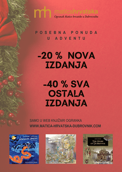 U adventskim danima, OMH U DUBROVNIKU pripremio je posebnu ponudu za sve čitatelje ; 20% popusta na najnovije naslove The Story of Dubrovnik i slikovnica “Ivan Gundulić” i “Zločesta godina” te 40% na sva ostala izdanja. Posjetite web knjižaru Ogranka www.matica-hrvatska-dubrovnik.com i stavite knjigu pod bor!