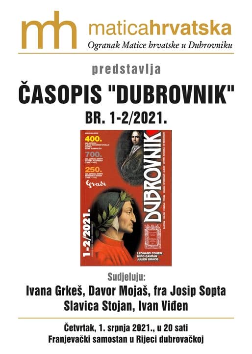 U klaustru franjevačkog samostana u Rijeci dubrovačkoj 1. srpnja 2021. predstavljen je novi broj časopisa za književnost i znanost Dubrovnik 1-2/2021. u izdanju Ogranka Matice hrvatske u Dubrovniku. Časopis su predstavili Ivana Grkeš, Davor Mojaš, fra Josip Sopta, Slavica Stojan i Ivan Viđen. Više na Dulistu i Dubrovačkom vjesniku