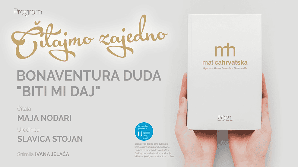 U četvrtom nastavku programa ”Čitajmo zajedno” Maja Nodari čita pjesmu fra. Bonaventure Dude ”Biti mi daj” Urednica: Slavica Stojan Ogranak Matice hrvatske u Dubrovniku, 2021. Snimatelj: Ivana Jelača