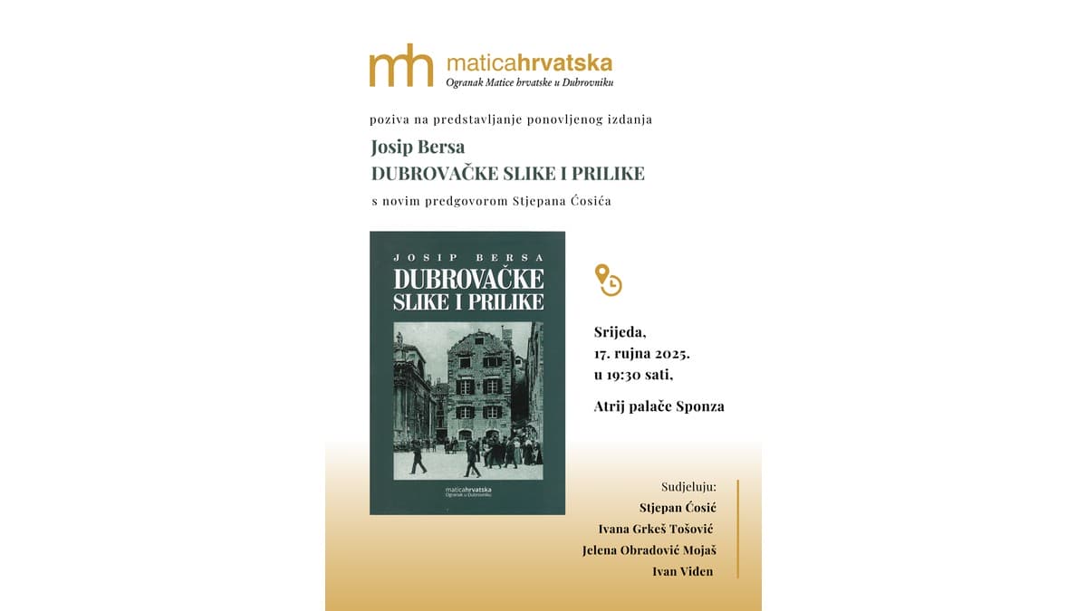 Ogranak Matice hrvatske u Dubrovniku predstavit će treće izdanje memoarsko-anegdotskog djela Dubrovačke slike i prilike, najvažnijeg književnog ostvarenja zadarskog pjesnika, prozaista i arheologa Josipa Berse (1862.–1932.), koji je djetinjstvo proveo u Dubrovniku. Prvi put objavljena 1941. godine, ova knjiga jedinstvena je kronika kulturne, društvene i političke povijesti Dubrovnika 19. stoljeća. Bersa donosi živopisne slike o...Opširnije→