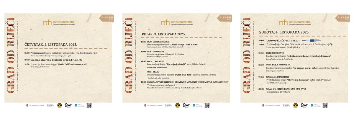 U četvrtak, 2. listopada 2025. u organizaciji OMH u Dubrovniku u prostorima TUP-a, a povodom 70 obljetnice djelovanja časopisa Dubrovnik, otvoren je drugi književno-kulturni festival Grad od riječi. Službenom otvorenju prethodio je panel na temu nakladništva i baštinske vrijednosti pisane riječi. Na panelu su sudjelovale dr. sc. Slavica Stojan, znanstvena savjetnica u trajnom zvanju, Paula...Opširnije→