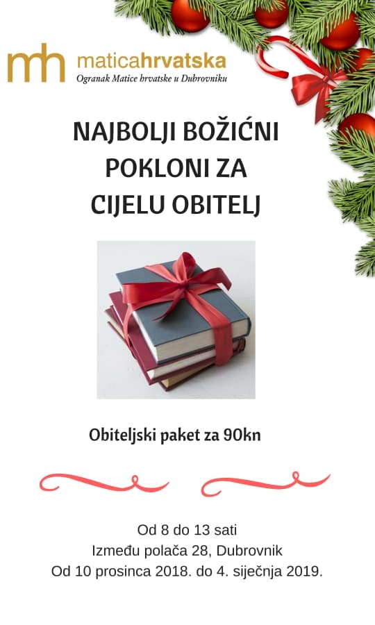 Tijekom adventa i božićnih praznika Ogranak Matice hrvatske u Dubrovniku pripremio je za svoje članove obiteljske poklone po sniženoj cijeni. Knjige se mogu kupiti od 10. prosinca 2018. do 4. siječnja 2019. na adresi Između polača 28 (od 08 do 13 sati).