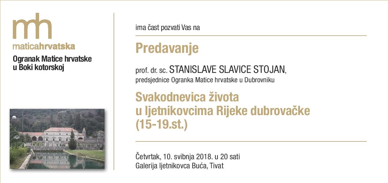 U četvrtak, 10.svibnja 2018. Predsjednica Ogranka MH u Dubrovniku Slavica Stojan će u Boki kotorskoj, u Tivtu govoriti o svakodnevnici života u dubrovačkim ljetnikovcima. Uobičajeno je bilo da se o tim ruševnim zdanjima govori samo s motrišta povijesti i povijesti umjetnosti, a u ovom predavanju bit će riječ o tome Tko je kada i zašto...Opširnije→