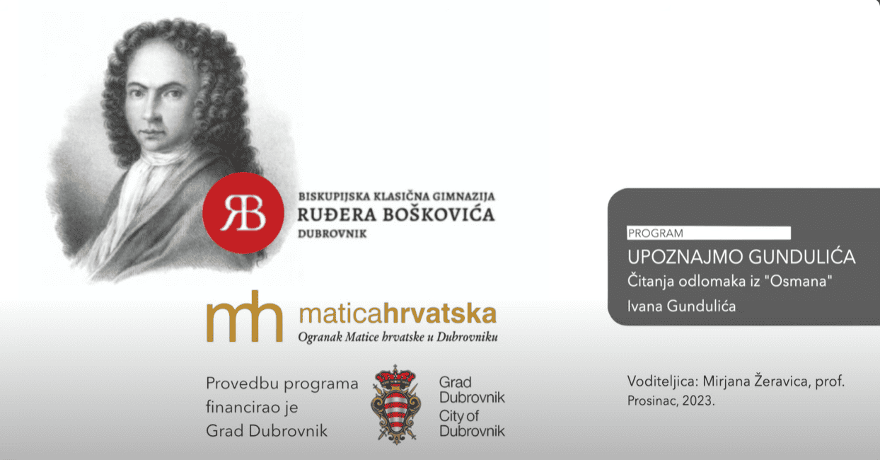 Program »Upoznajmo Gundulića« suradnja je Ogranka Matice hrvatske u Dubrovniku i Biskupijske klasične gimnazije Ruđera Boškovića. Voditeljica je programa profesorica hrvatskoga jezika i književnosti Mirjana Žeravica, a sudionici učenici svih razreda klasične gimnazije. U projektu se vođenim čitanjem učenici trebaju upoznati s porukama Gundulićeva djela, njegovim kršćanskim svjetonazorom, pobliže upoznati Gundulićev jezik i pjesnika koji...Opširnije→