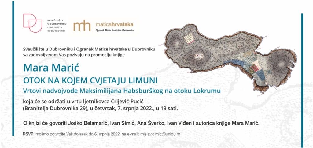 Sveučilište u Dubrovniku i Ogranak Matice hrvatske u Dubrovniku predstavljaju knjigu Mare Marić ”Otok na kojem cvjetaju limuni. Vrtovi nadvojvode