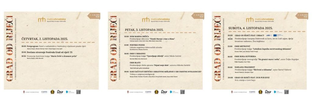 U četvrtak, 2. listopada 2025. u organizaciji OMH u Dubrovniku u prostorima TUP-a, a povodom 70 obljetnice djelovanja časopisa Dubrovnik, otvoren je drugi književno-kulturni festival Grad od riječi. Službenom otvorenju prethodio je panel na temu nakladništva i baštinske vrijednosti pisane riječi. Na panelu su sudjelovale dr. sc. Slavica Stojan, znanstvena savjetnica u trajnom zvanju, Paula...