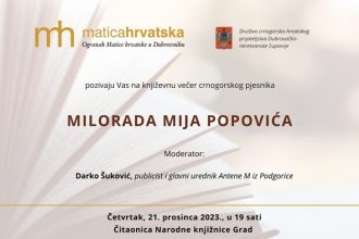 U četvrtak, 21. prosinca 2023. u Saloči od zrcala u Knjižnici održana je književna večer posvećena jednomu od najznačajnijih crnogorskih pjesnika, Miloradu Miju Popoviću. Moderator događanja bio je Darko Šuković, izdavač i glavni urednik Antene M iz Podgorice. Događanje je suradnja između Društva crnogorsko-hrvatskog prijateljstva DNŽ Dubrovnik, Savez Crnogoraca Hrvatske, Ogranak Matice hrvatske u Dubrovniku […]