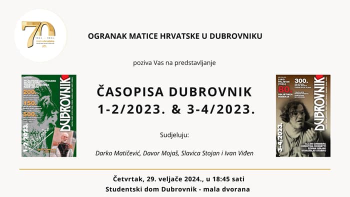 U četvrtak, 29. veljače u 18:45 h, u maloj dvorani Studentskog doma u Dubrovniku, Ogranak Matice hrvatske u Dubrovniku predstavit će posljednje brojeve svog časopisa Dubrovnik (1-2/2023. i 3-4/2023.) objavljene u prethodnoj 2023. godini.